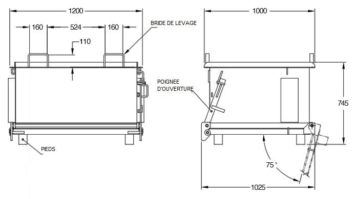 Benne à fond ouvrant 500 litres, charge 1000 Kg