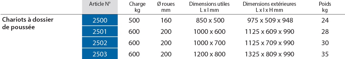 Chariots multifonctions Système modulable Le chariot peut être modifié, complété, les différents éléments sont positionnés dans les inserts des plateformes 2590-2593 et boulonnés. Tube d’acier revêtement époxy RAL 5007. Plateforme en mélaminé surface effet hêtre. 2 roues pivotantes et 2 roues fixes à bandage TPE 160 x 40 mm ou 200 x 40 mm, moyeu à roulement à billes central. Roues gonflables 220 x 70 mm avec supplément, moyeu à roulement à rouleaux. Freins sur roues pivotantes conformément à la Norme Européenne EN 1757-3 (Sécurité des chariots de manutention). Hauteur de plateau pour roues: TPE Ø 160 = 228 mm TPE Ø 200= 270 mm Gonflables Ø 220 = 285 mm