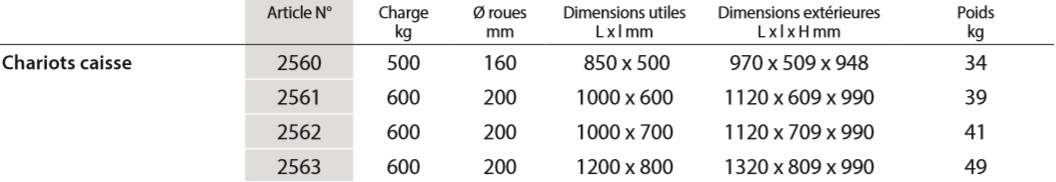 Chariots caisse 2560 | 2561 | 2562 | 2563 Chariots caisse en bois, hauteur des côtés 250 mm, tous les côtés amovibles. Largeur utile = largeur plateforme – 60 mm