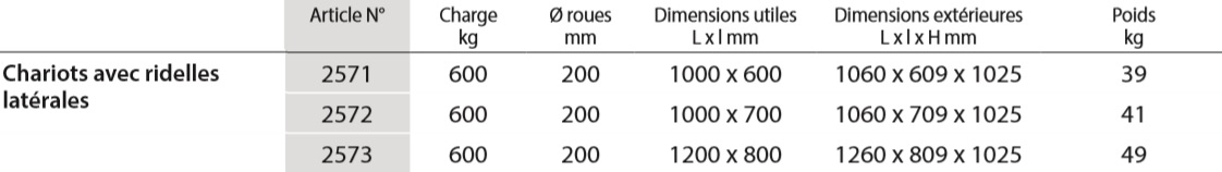 Chariots avec ridelles latérales en tube 2571 | 2572 | 2573 Chariots à ridelles latérales avec barres verticales distantes de 130 mm. Hauteur des ridelles 750 mm. Largeur utile = largeur plateforme – 60 mm