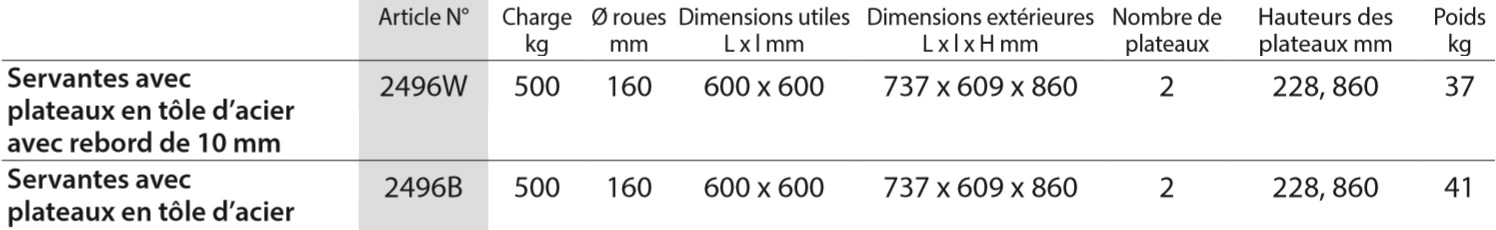 Servantes Système modulable Ensemble mécano-soudé et assemblé selon le principe des « inserts fetra ». • Plateaux en tôle d´acier soudés de niveau dans l´armature, revêtement époxy bleu RAL 5007. • Egalement disponible en plateaux tôlés étanches avec rebords de 10 mm. 2 roues pivotantes et 2 roues fixes à bandage TPE 160 x 40 ou 200 x 40 mm, moyeu à roulement à billes central. Roues gonflables 220 x 70 mm avec supplément, moyeu à roulement à rouleaux. Freins sur roues pivotantes conformément à la Norme Européenne 1757-3 (Sécurité des chariots de manutention). Charge plateau du haut 200 kg