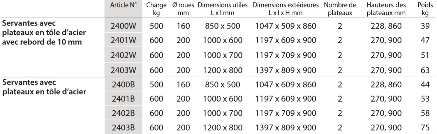 Servantes Système modulable Ensemble mécano-soudé et assemblé selon le principe des « inserts fetra ». • Plateaux en tôle d´acier soudés de niveau dans l´armature, revêtement époxy bleu RAL 5007. • Egalement disponible en plateaux tôlés étanches avec rebords de 10 mm. 2 roues pivotantes et 2 roues fixes à bandage TPE 160 x 40 ou 200 x 40 mm, moyeu à roulement à billes central. Roues gonflables 220 x 70 mm avec supplément, moyeu à roulement à rouleaux. Freins sur roues pivotantes conformément à la Norme Européenne 1757-3 (Sécurité des chariots de manutention). Charge plateau du haut 200 kg.