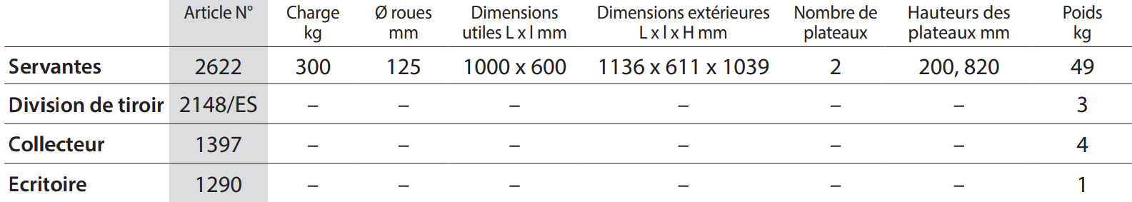 Servantes Système modulable Ensemble mécano-soudé et assemblé selon le principe des «inserts fetra». Revêtement époxy, bleu RAL 5007, plateaux en mélaminé surface effet hêtre encastrés dans les cornières, rebords 12 mm. 2 roues pivotantes et 2 roues fixes à bandage TPE, moyeu à roulement à billes central. Freins sur roues pivotantes conformément à la Norme Européenne 1757-3 (Sécurité des chariots de manutention). Charge plateau haut et médian 80 kg