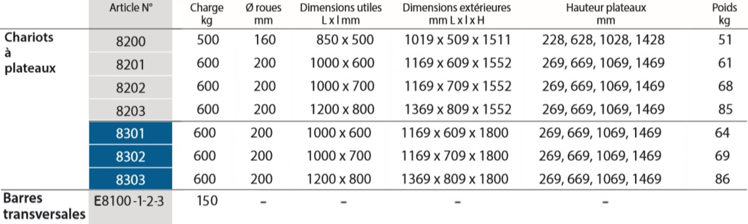 Chariots à plateaux Système modulable Ensemble mécano-soudé et assemblé selon le principe des «inserts fetra», revêtement époxy bleu RAL 5007. 3 hauteurs de ridelles. 1 plateau de base fixe et 2, 3 ou 4 amovibles en mélaminé surface effet hêtre. Plateaux amovibles réglables au pas de 100 mm. Charge par plateau 90 kg. Roues: 2 roues pivotantes et 2 roues fixes à bandage TPE 160 x 40 mm ou 200 x 40 mm, moyeu à roulement à billes central. Freins sur roues pivotantes conformément à la Norme Européenne EN 1757-3 (Sécurité des chariots de manutention).