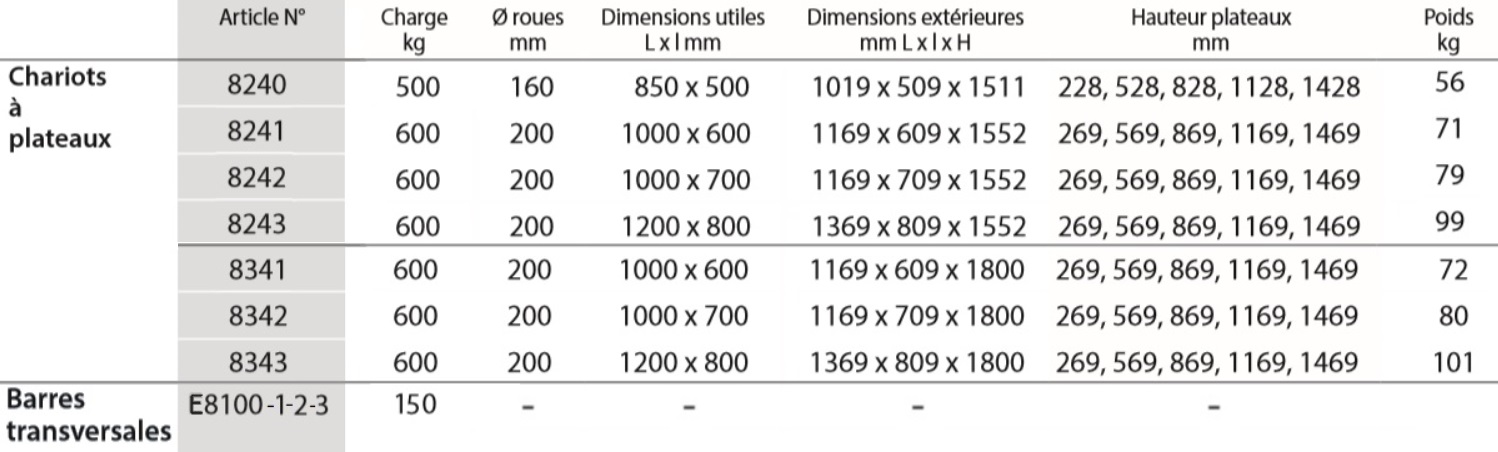 E8100-1-2-3 : Barres transversales, augmente la charge du plateau à 150 kg, livrées par paire pour un plateau.