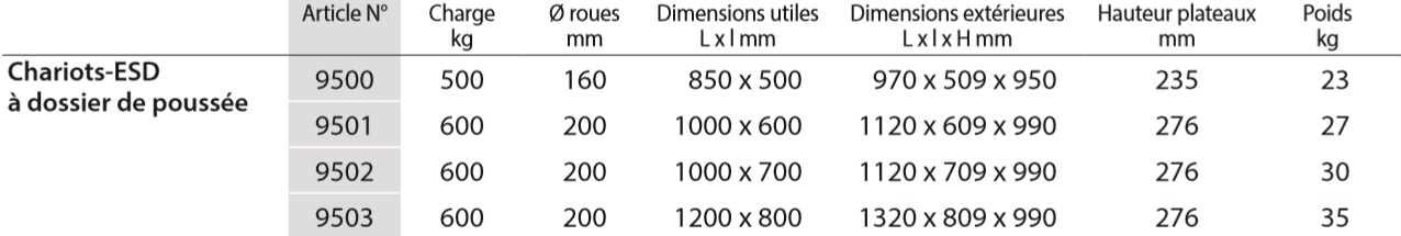 Chariots-ESD à dossier de poussée 9500 | 9501 | 9502 | 9503 Construction conductrice d´électricité (ESD=Electrostatic discharge). Ensemble mécano-soudé et assemblé selon le principe des «inserts fetra». Revêtement et plateaux conducteurs d’électricité selon Norme DIN 68765. 2 roues pivotantes et 2 fixes à bandage TPE-ESD, moyeu à roulement à billes central. Freins sur roues pivotantes, conformément à la norme EN 1757-3 (Sécurité des chariots de manutention).