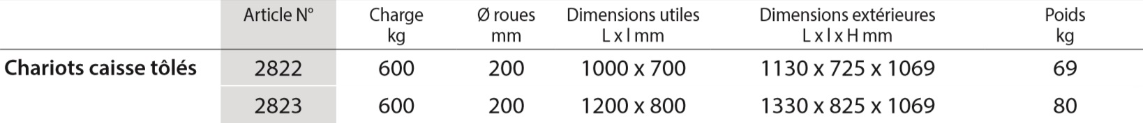Chariots caisse tôlés 2822 | 2823 Construction comme 2842 | 2843, avec panneaux en tôle d’acier zinguée, collés dans les profilés. Hauteur utile: 816 mm