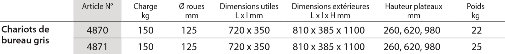 Chariots de bureau construction boulonnée, revêtement époxy gris clair RAL 7035. Plateaux et cloisons gris clair. 4 roues pivotantes à bandage TPE 125 x 32 mm. Déplacement léger et confortable, roues non traçantes, moyeu à palier lisse. 2 roues avec freins conformément à la Norme Européenne EN 1757-3 (Sécurité des chariots de manutention). Livré démonté, roues montées. Montage facile. Charge par étagère 50 kg