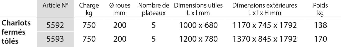 Chariots fermés tôlés 5492 | 5493 Ensemble mécano-soudé, revêtement époxy bleu RAL 5007. Habillage en tôle d’acier zinguée. Porte à double battant en profilé d’acier et fermeture verticale par serrure à cylindre. 1 étagère fixe et 4 amovibles en mélaminé surface effet hêtre. 2 roues pivotantes et 2 fixes à bandage TPE (Élastomère thermoplastique), moyeu à roulement à billes de précision. TOTALSTOP: Chariots équipés de série du système de freinage centralisé du côté des roues pivotantes, conformément à la Norme Européenne EN 1757-3 (Sécurité des chariots de manutention). Déplacement confortable : Peu de résistance au démarrage, au déplacement et à la rotation. Déplacement peu bruyant sur sols plats, bandage non traçant. Hauteur étagères: 292, 582, 882, 1182, 1482 mm Distance entre étagères: 280 mm. Plateaux amovibles réglables au pas de 100 mm. Charge par étagère 90 kg