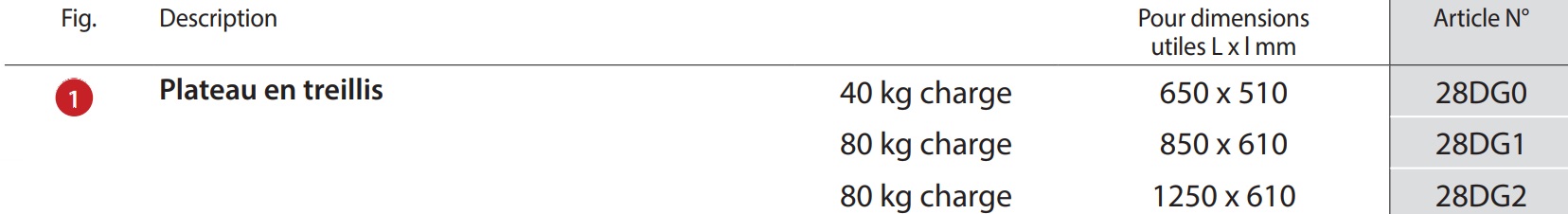 1) Plateau en treillis métallique Plateau en treillis métallique galvanisé de 120 x 30 mm. Avec rebords de 23 mm cintrés vers le haut d´un côté et vers le bas de l´autre. Réglable au pas de 100 mm soit horizontalement ou avec inclinaison. Charge 40 kg ou 80 kg