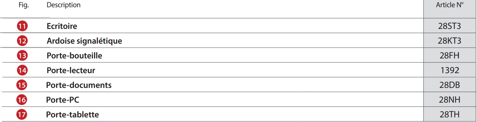11) Tablette écritoire S’accroche dans le treillis avec un support permettant de régler l’inclinaison. Pince à papier en tôle d’acier avec revêtement époxy gris RAL 7035. Dimensions utiles longueur 352 mm hauteurs 335 mm.
