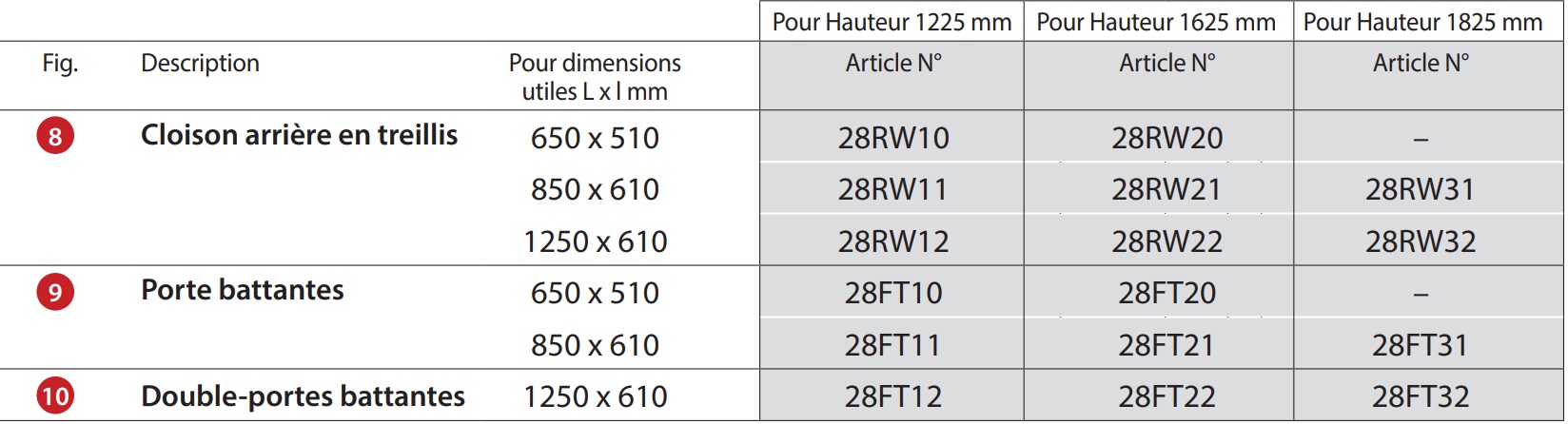 8) Cloison arrière Cloison pour grand côté en treillis galvanisé, mailles de 100 x 50 mm. 3 hauteurs et 3 longueurs selon configuration et taille des chariots.