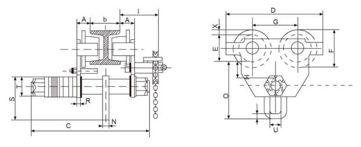 Chariots porte palans manuel à chaîne pour palans à chaîne électriques ou manuels, réglage de l’écartement par empilage de rondelles permettant de se monter sur un grand nombre de section d’acier, la translation se fait par commande chaîne. Nos chariots porte palan manuels série HGT sont équipé de 4 galets à joue moyeu sur roulements à billes de précision pour un déplacement sans efforts. Chariots porte palans conforme aux normes CE. Vendu avec chaine de manœuvre longueur 3 mètres.
