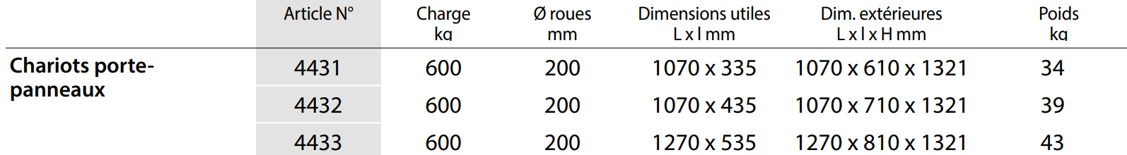 - Chariots porte panneaux avec tubes cintrés fixes,