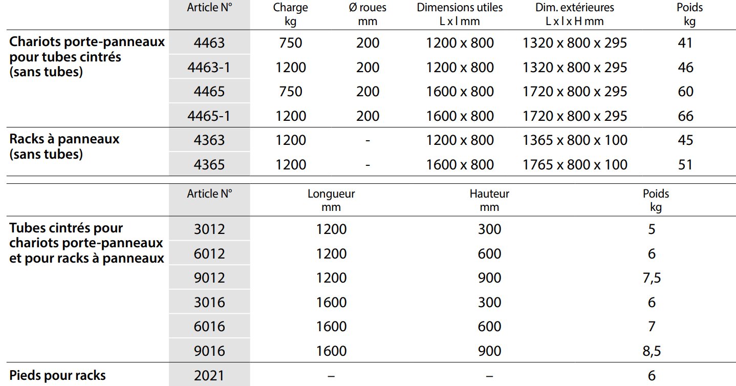 Racks à panneaux 4363 | 4365 En profilé et tube d’acier mécano-soudés, revêtement époxy. Plateau en contreplaqué hydrofuge et antidérapant. 4 pieds réglables. 7 compartiments. Livraison sans tubes cintrés. Largeur des compartiments 90 mm. 6 rouleaux sur petit côté, aide au rangement des panneaux.