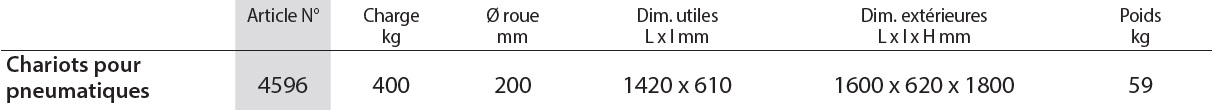 4586 Support de pneumatique réglable au pas de 150 mm avec ridelle en tôle d’acier. Pour diamètre de roues 250-750 mm. 4 roues pivotantes à bandage TPE, moyeu à roulement à billes central. 2 roues avec freins..