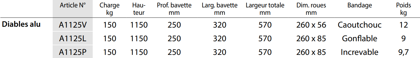 Diables aluminium charges hautes Ensemble mécano-soudé en aluminium, poignées de sécurité en plastique dur. Soigneusement soudé sans revêtement. Bavette en tôle d´alu à boulonner et de ce fait remplaςable. Roues au choix: à bandage caoutchouc, gonflables ou increvables avec mousse polyuréthane sur jante plastique, moyeu à roulement à rouleaux. Tablier cintré permettant d’embarquer des éléments ronds tels que rouleaux, bidons, seaux etc. Livré démonté.