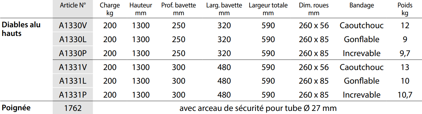 Diables aluminium charges hautes Ensemble mécano-soudé en aluminium, poignées de sécurité en plastique dur. Soigneusement soudé sans revêtement. Bavette en tôle d´alu à boulonner et de ce fait remplaςable. Roues au choix: à bandage caoutchouc, gonflables ou increvables avec mousse polyuréthane sur jante plastique, moyeu à roulement à rouleaux. Tablier cintré permettant d’embarquer des éléments ronds tels que rouleaux, bidons, seaux etc. Livré démonté.