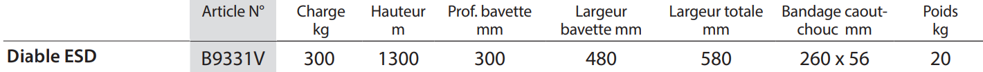 Diable ESD B9116V | B9125V | B9331V Construction conductrice d‘électricité (ESD = Electrostatic Discharge). Diables en tube d‘acier et bavette en tôle d‘acier, l‘ensemble conducteur d‘électricité, construction mécano-soudé très robuste, revêtement époxy gris ardoise RAL 7015, poignées ESD, bavette boulonnée et de ce fait remplaçable. Roues à bandage caoutchouc ESD sur jantes en plastique, moyeu à roulement à rouleaux.