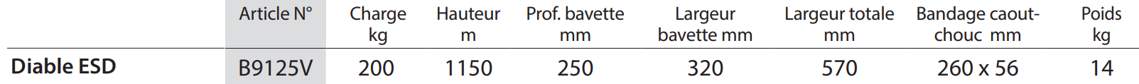 Diable ESD B9116V | B9125V | B9331V Construction conductrice d‘électricité (ESD = Electrostatic Discharge). Diables en tube d‘acier et bavette en tôle d‘acier, l‘ensemble conducteur d‘électricité, construction mécano-soudé très robuste, revêtement époxy gris ardoise RAL 7015, poignées ESD, bavette boulonnée et de ce fait remplaçable. Roues à bandage caoutchouc ESD sur jantes en plastique, moyeu à roulement à rouleaux.