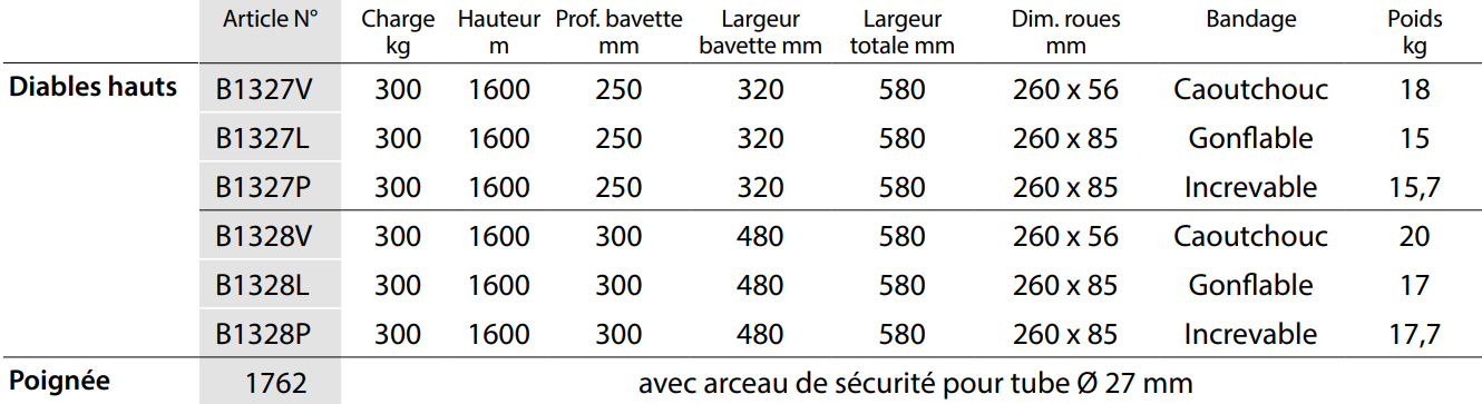 Diable haut (1600mm) en tube acier FETRA charges 300 Kg