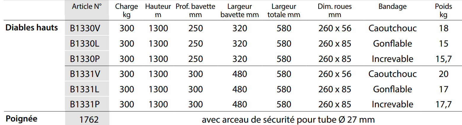 Diables en tube d‘acier pour charges hautes Ensemble mécano-soudé. Revêtement époxy bleu RAL 5007 uniquement, poignées de sécurité en plastique dur. Bavette en tôle d´acier à boulonner et de ce fait remplaςable. Roues au choix: à bandage caoutchouc, gonflables ou increvables avec mousse polyuréthane sur jante plastique, moyeu à roulements à rouleaux. Tablier cintré permettant d’embarquer des éléments ronds tels que rouleaux, bidons, seaux etc. Livré démonté. Modéle breveté 20 2004 010 071.1