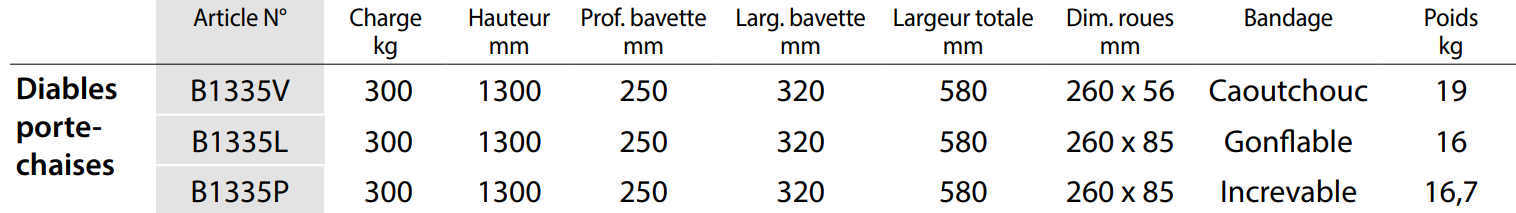 Diables porte-chaises B1335V | B1335L | B1335P pour le transport de chaises empilées. Constitué d´un diable référence B1325 V | B1325L et d´un support en tube acier. Construction solidement soudée, revêtement époxy bleu RAL 5007 uniquement, poignées de sécurité. Roues au choix: à bandage caoutchouc, gonflables ou increvables avec mousse polyuréthane sur jante plastique, moyeu à roulements à rouleaux. Tablier cintré permettant d’embarquer des éléments ronds tels que rouleaux, bidons, seaux etc. Les tubes du support sont recouverts d’un revêtement de protection en PVC. Le support autobloquant (arcboutement) est facilement mis en place et peut se régler en hauteur. Le support s´escamote à l´arrière des tubes du diable et est maintenu par une bande velcro. Profondeur support 500 mm Largeur support 250 mm Charge 70 kg Modéle breveté 10 2004 034 195
