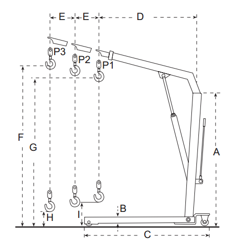 Grue d'atelier pratique et maniable grâce à son système unique de bras stabilisateurs repliables offrant un gain de place considérable lors de son rangement et à ses roulettes pivotantes permettant un déplacement en toute facilité. Equipé d’une pompe hydraulique a levée rapide double action, d’une soupape de sécurité contre les surcharges et d’un crochet a linguet de sécurité pivotant à 360°. 3 Positions de la flèche pour des charges de 1500 à 2000 Kg.