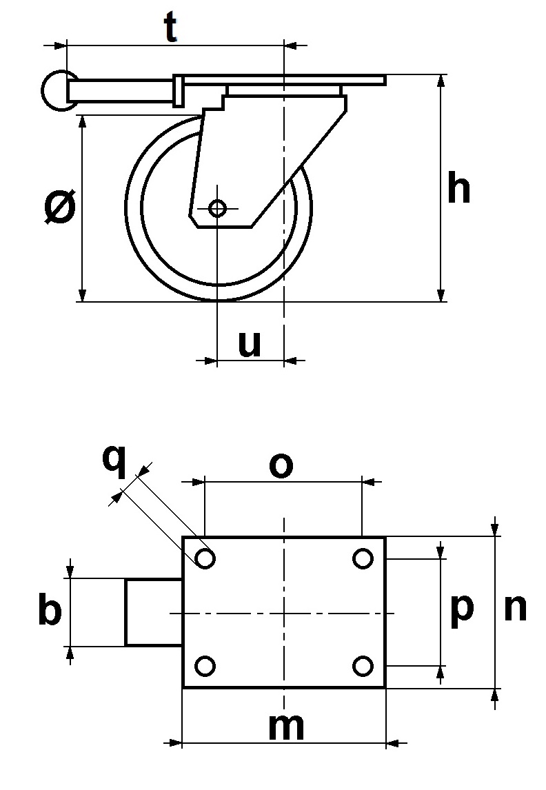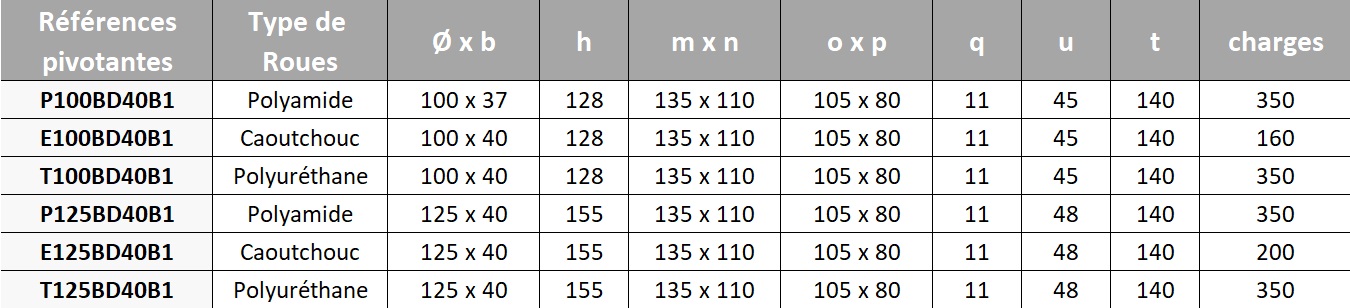 Roulette pivotante à platine + système de blocage de direction 4 positions, série BD40