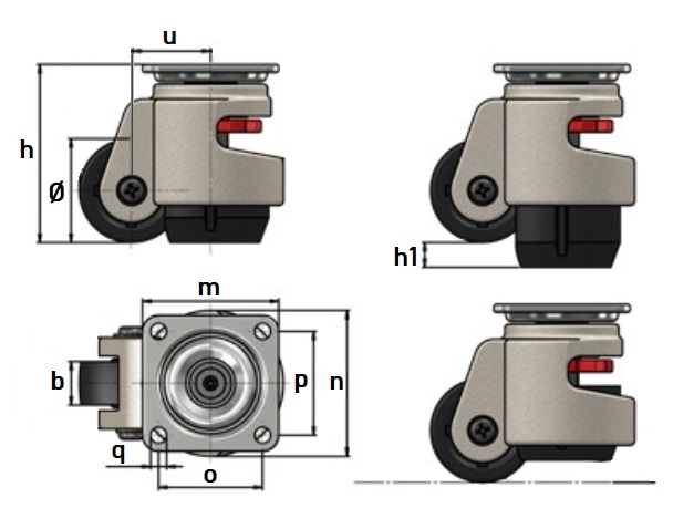 - Patin d’immobilisation en caoutchouc, réglable par molette.