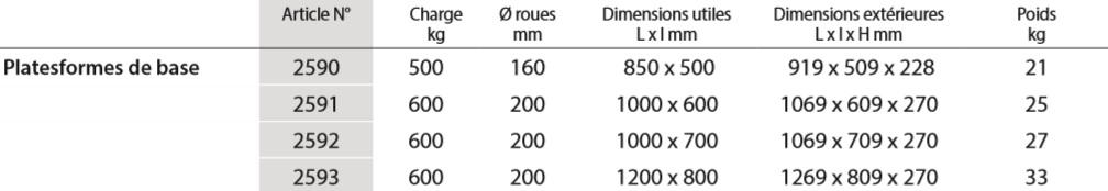 Chariots multifonctions Système modulable Le chariot peut être modifié, complété, les différents éléments sont positionnés dans les inserts des plateformes 2590-2593 et boulonnés. Tube d’acier revêtement époxy RAL 5007. Plateforme en mélaminé surface effet hêtre. 2 roues pivotantes et 2 roues fixes à bandage TPE 160 x 40 mm ou 200 x 40 mm, moyeu à roulement à billes central. Roues gonflables 220 x 70 mm avec supplément, moyeu à roulement à rouleaux. Freins sur roues pivotantes conformément à la Norme Européenne EN 1757-3 (Sécurité des chariots de manutention). Hauteur de plateau pour roues: TPE Ø 160 = 228 mm TPE Ø 200= 270 mm Gonflables Ø 220 = 285 mm