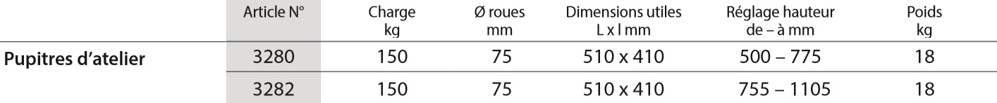 3280 | 3282 Plateau en tôle d´acier avec 1 rebord sur grand côté, horizontal ou inclinable de 0°, 15° et 30°. Hauteur réglable au pas de 25 mm.