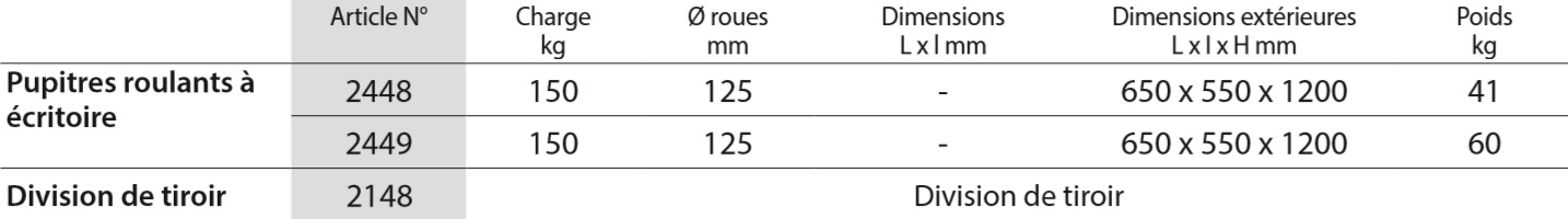 Pupitre roulant à écritoire 2448 Pupitre roulant à écritoire en acier avec serrure et sous-main plastifié, revêtement époxy gris RAL 7035. Tablette écritoire ouvrante, hauteur 1034/1197 mm. Plan incliné à env. 18° avec reglette de maintien de doucuments.