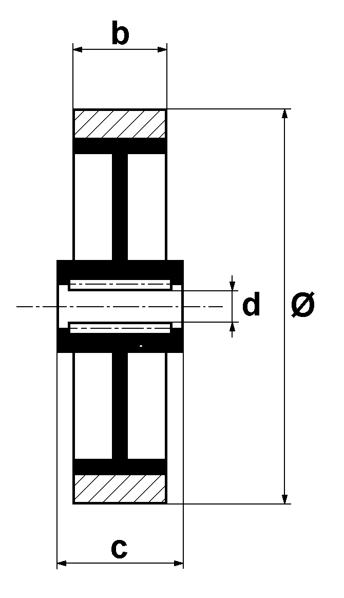 Roue à bandage polyuréthane injecté, jante polyamide, (série N) rouleaux inox
