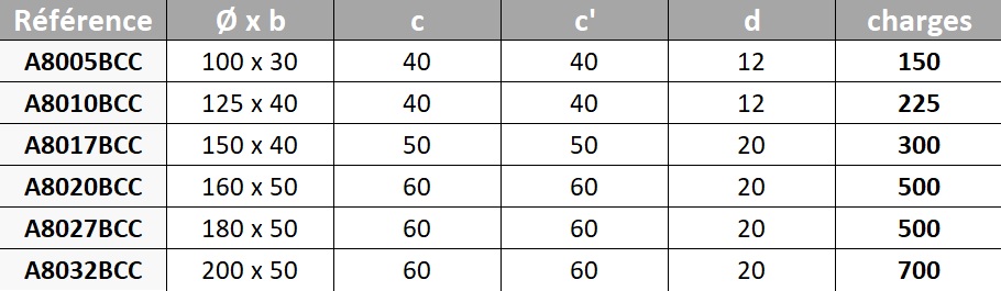 - Roues : bandage polyuréthane souple bleu, dureté 78 shore A, coulé sur jante aluminium, série TB.
