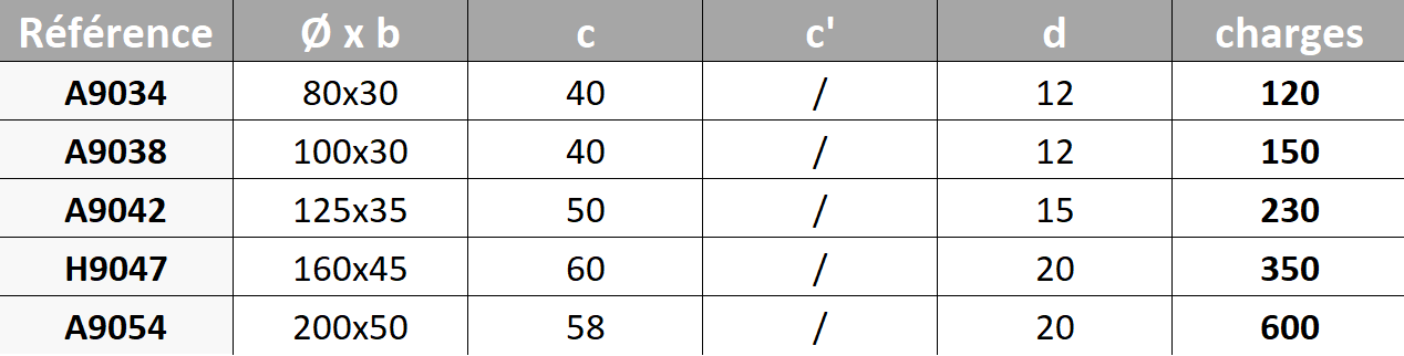 - Les cotes sont exprimées en mm et les charges en kg