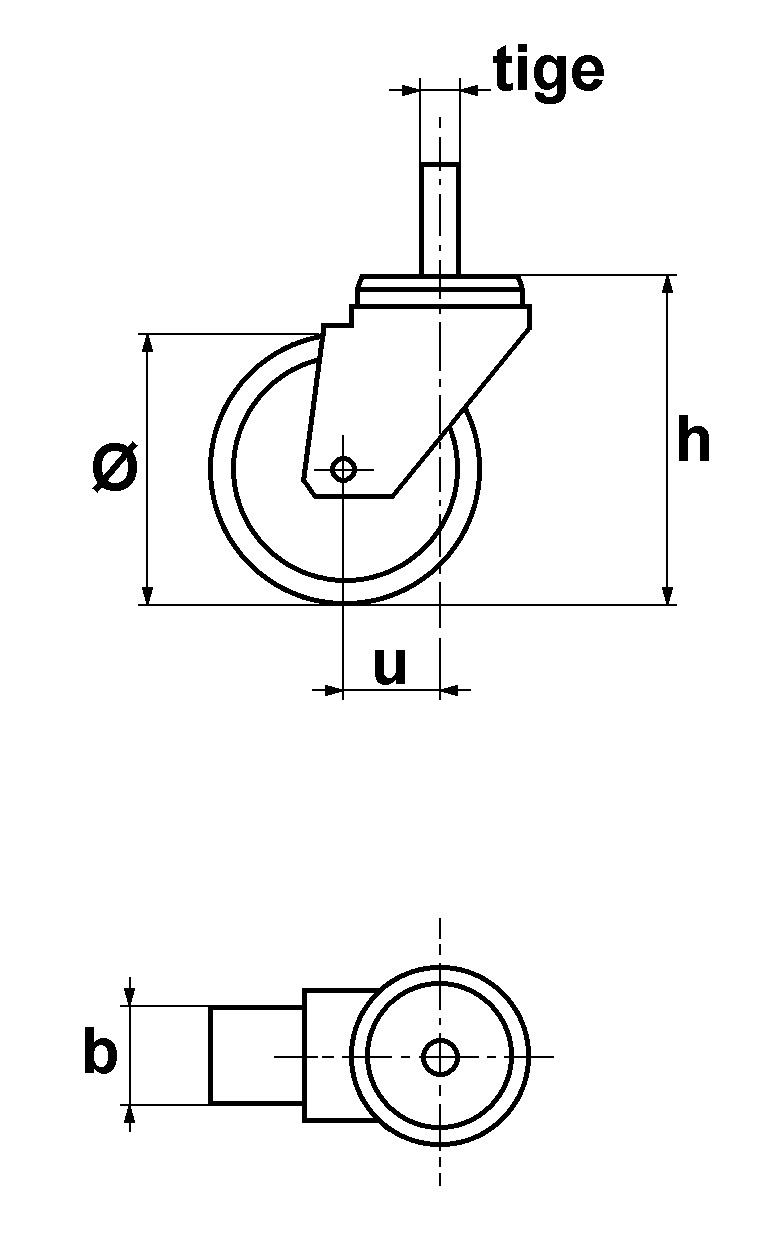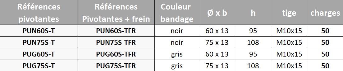 • Roulettes pivotantes, pivotantes + frein à tige filetée.
