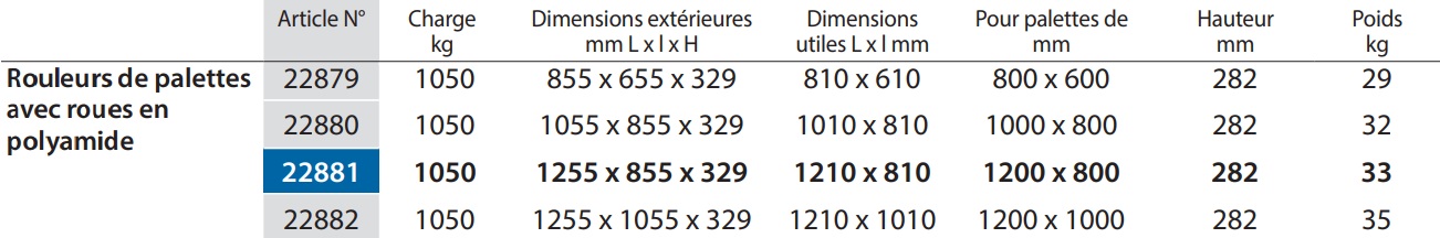 22879 | 22880 22881 | 22882 Charge 1050 kg Roues en polyamide 200 x 50 mm, moyeu à roulement à rouleaux, roulement aisé et non traçant, roues résistantes aux agents corrosifs. Roulement bruyant.