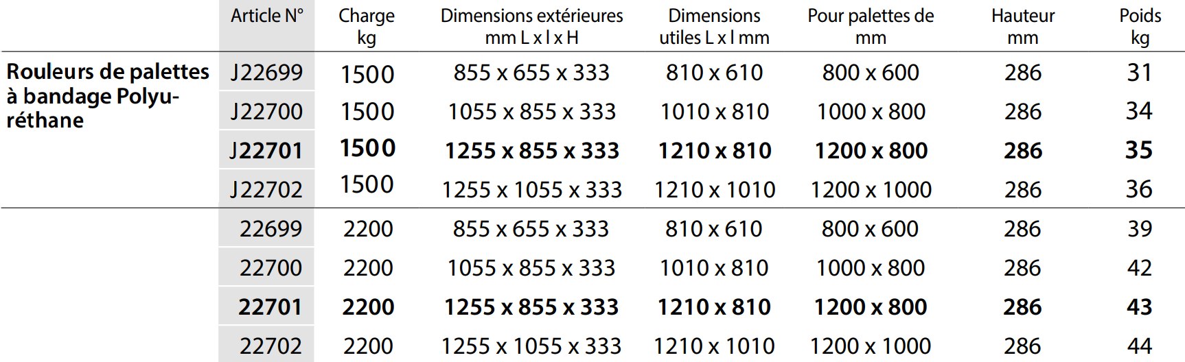 22699 | 22700 22701 | 22702 Charge 2200 kg Configuration charges lourdes, bandage Polyuréthane 200 x 50 mm. Moyeu à roulement à billes. Peu de résistance au déplacement, roulement confortable et sans bruit.