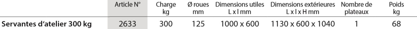 Servantes d´atelier Système modulable Ensemble mécano-soudé et assemblé selon le principe des «inserts fetra», revêtement époxy bleu RAL 5007. Plateaux en mélaminé surface effet hêtre, encastrés dans les cornières. 2 roues pivotantes et 2 roues fixes à bandage TPE, moyeu à roulement à billes central. Freins sur roues pivotantes conformément à la Norme Européenne EN 1757-3. Hauteur du plan de travail: 820 mm Hauteur totale: 1040 mm Longueur totale: 1130 mm Charge par étagère placard 30 kg, par tiroir 25 kg.