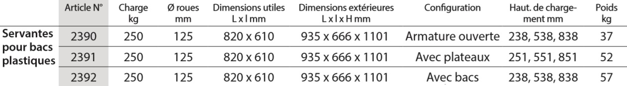 - 3 plateaux amovibles, armature ouverte et 6 bacs plastiques 600 x 400 x 145 mm (2392).