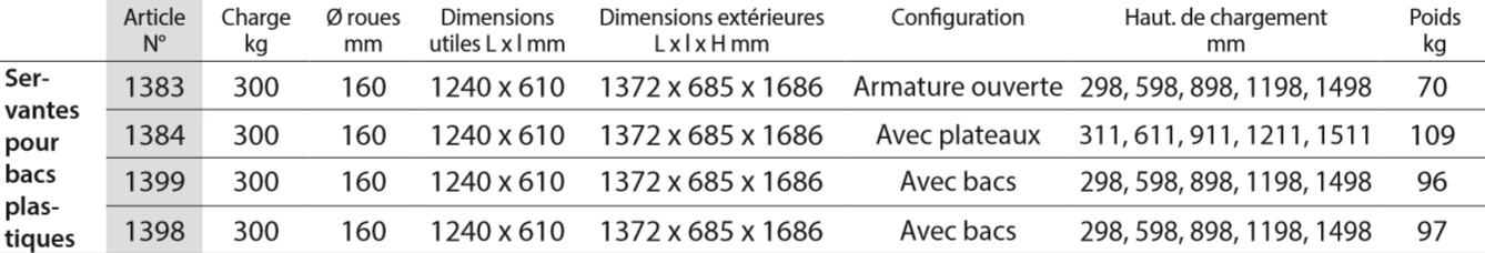 1398 Avec bacs plastiques 3 bacs de 600 x 400 x 145 mm 6 bacs de 600 x 400 x 170 mm 6 bacs de 600 x 400 x 220 mm.
