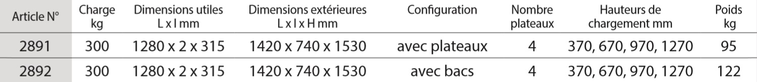 2891 Chariot 2 faces, 4 plateaux à 2 côtés en mélaminé, rebord de 12 mm de haut.